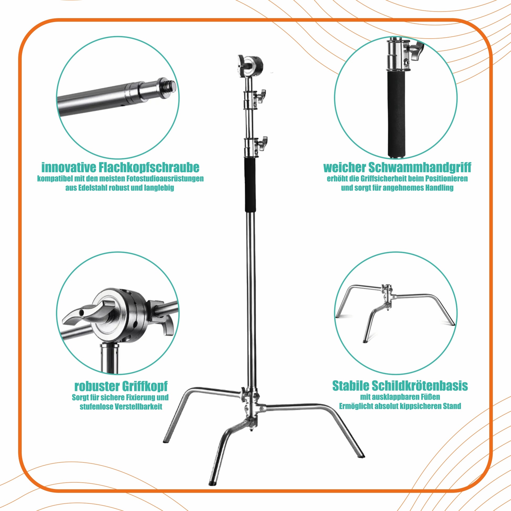 Die stabile Schildkrötenbasis mit klappbaren Beinen bietet zuverlässigen Halt auf jedem Untergrund. Durch die robuste Edelstahlverarbeitung ist das Stativ extrem langlebig und tragfähig – selbst bei häufigem Transport oder intensiver Nutzung.