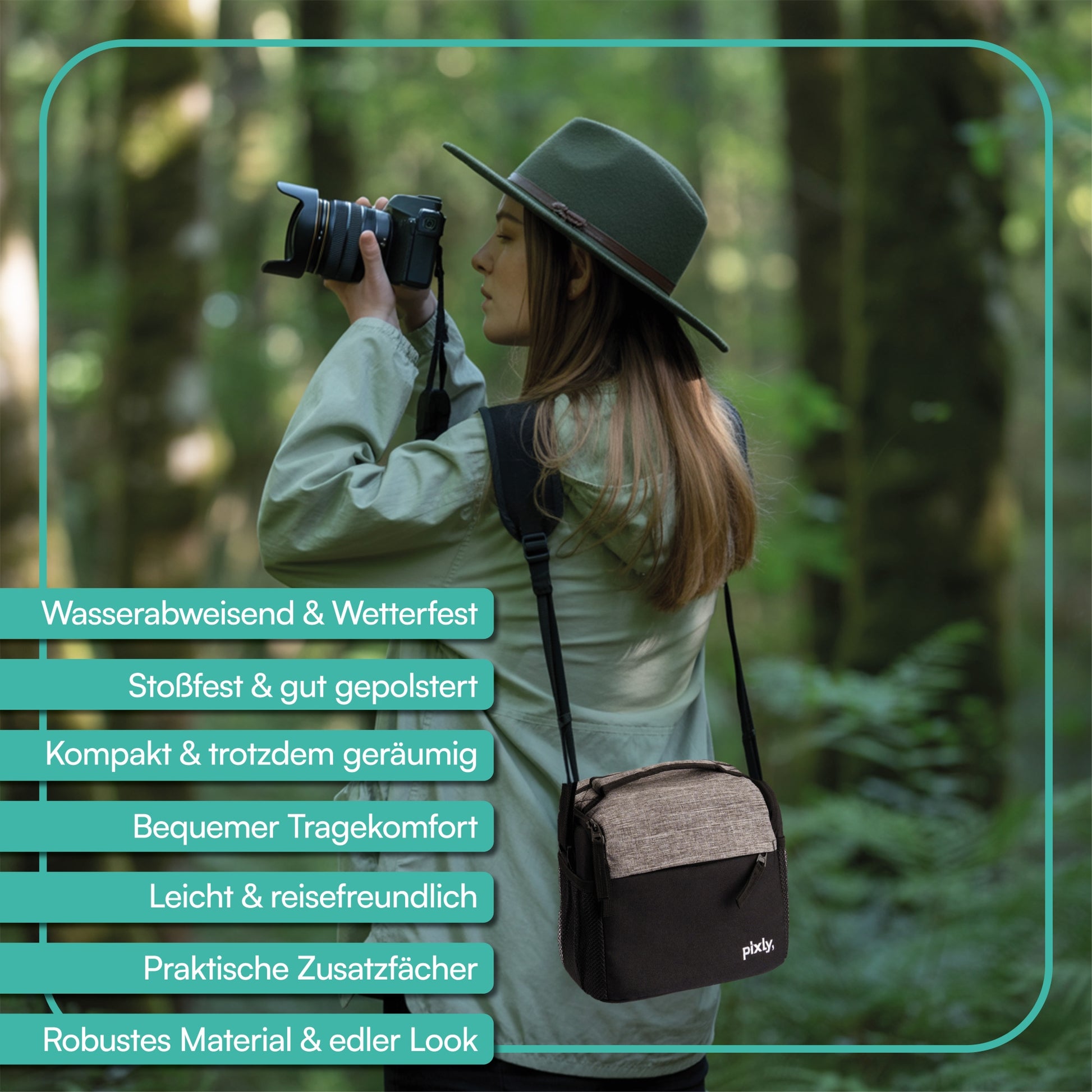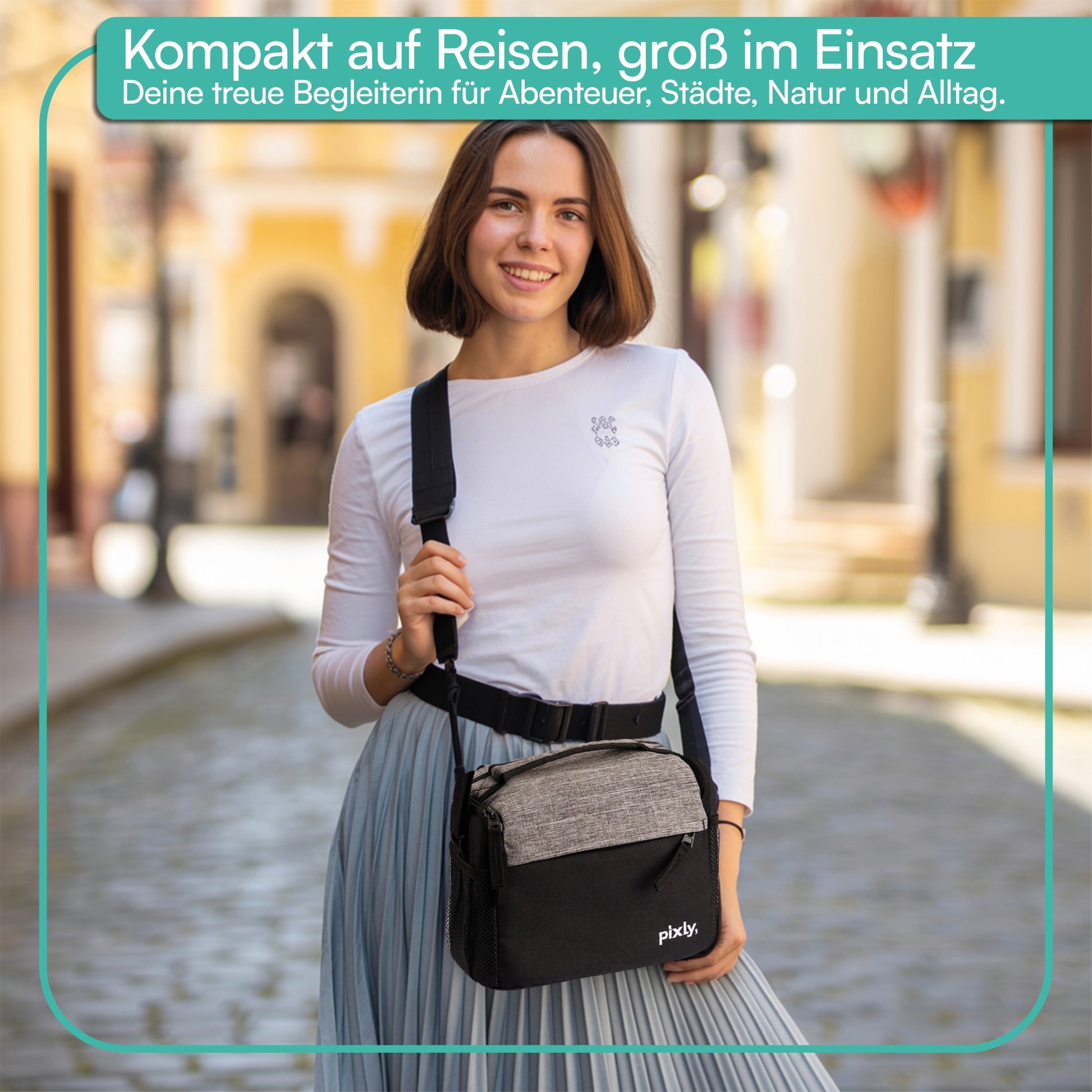 Die Pixly Kamera Tasche ist die ideale Wahl für Fotografen, die ihre Ausrüstung sicher und organisiert transportieren möchten. Mit ihrem wasserabweisenden Material schützt die Tasche deine Kamera und Objektive zuverlässig vor Spritzwasser und Schmutz – perfekt für Outdoor-Fotografie und Reisen.