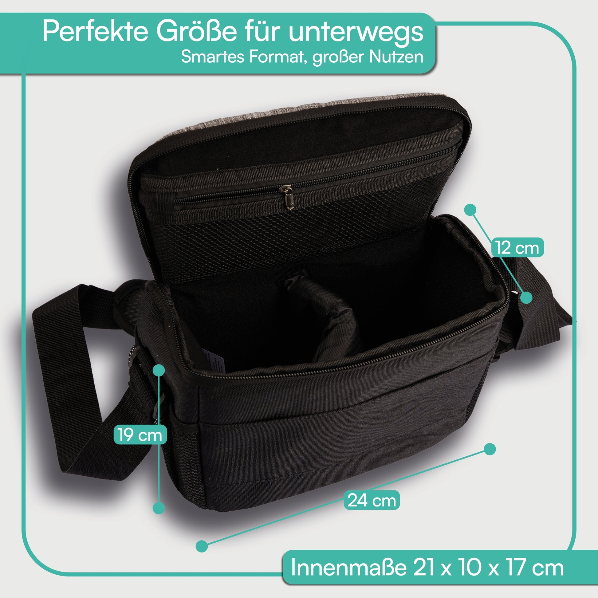 Mit Außenmaßen von 24x12x19 cm und Innenmaßen von 21x10x17 cm ist die Tasche kompakt und dennoch geräumig genug für die wichtigste Fotoausrüstung.