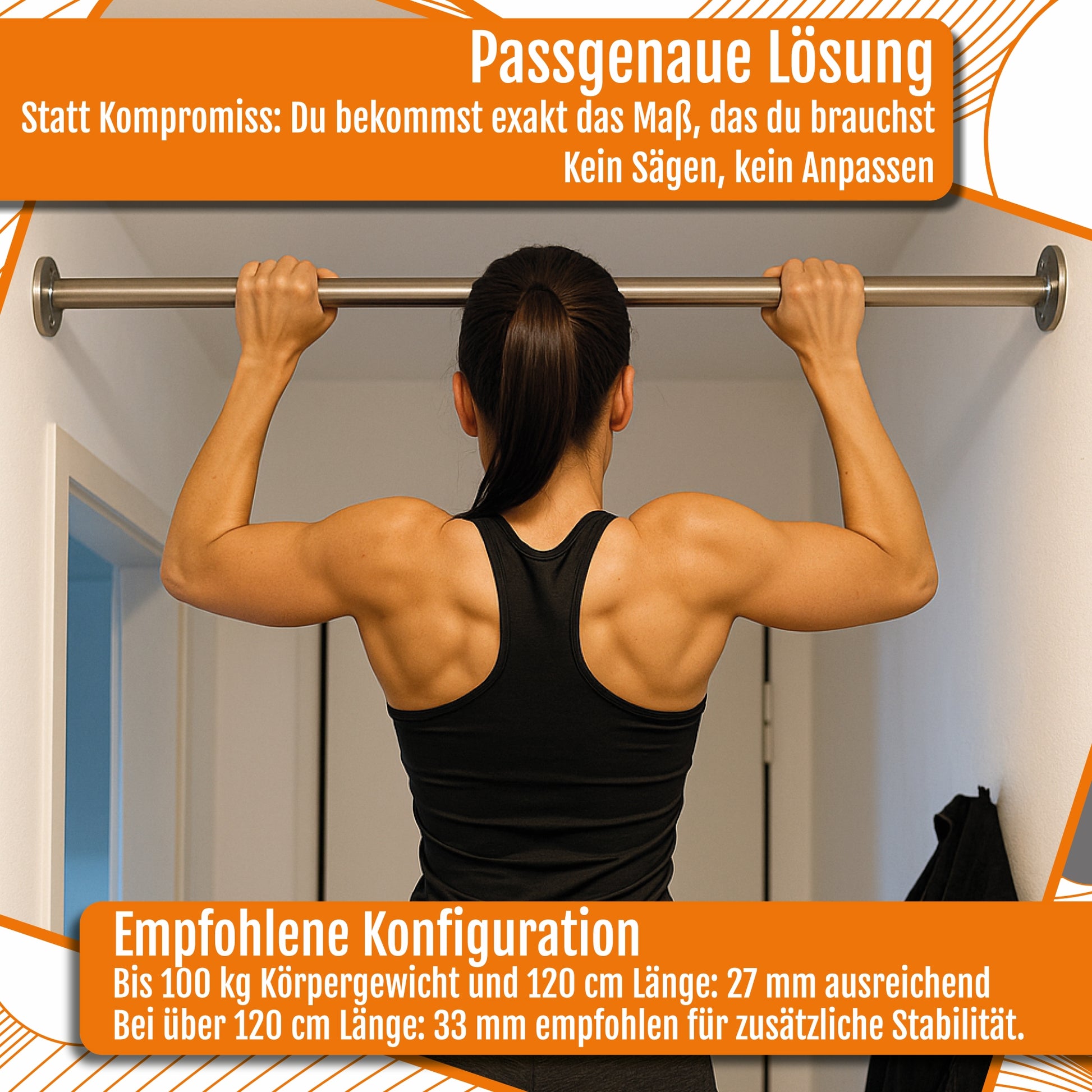 Die maßgefertigte Klimmzugstange kann auf bis zu 150 cm angepasst werden, sodass sie in viele Raumgrößen passt. Die robuste Edelstahlkonstruktion sorgt für langfristige Haltbarkeit und Stabilität, auch bei intensivem Training. Die wahlweise Durchmesser von 27 mm und 33 mm bieten dir die Möglichkeit, die für dich perfekte Griffigkeit zu wählen. Ab einer Länge von 120 cm empfehlen wir den größeren 33 mm Durchmesser für zusätzlichen Komfort und Sicherheit.