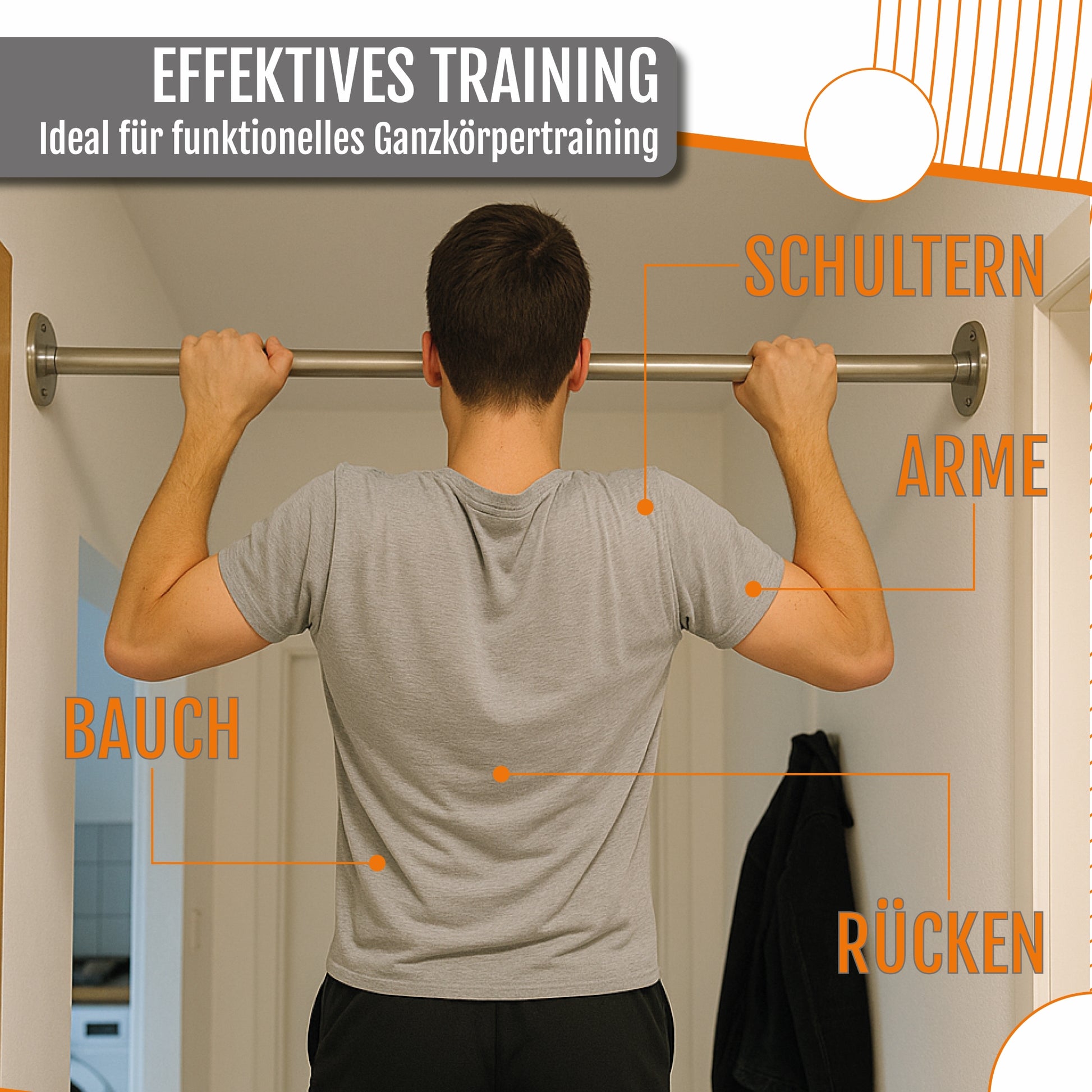 Die Klimmzugstange aus Edelstahl von Active Peak ist für alle, die professionelle Qualität und stabile Sicherheit in ihrem Training suchen. Diese massive Stange wird zwischen zwei Wänden montiert und eignet sich hervorragend für Klimmzüge, Calisthenics, Muscle-ups und weitere Kraftübungen. Nie wieder wackelige Türrahmen oder unsichere Lösungen – diese Stange bietet eine zuverlässige, feste Basis für dein Training.