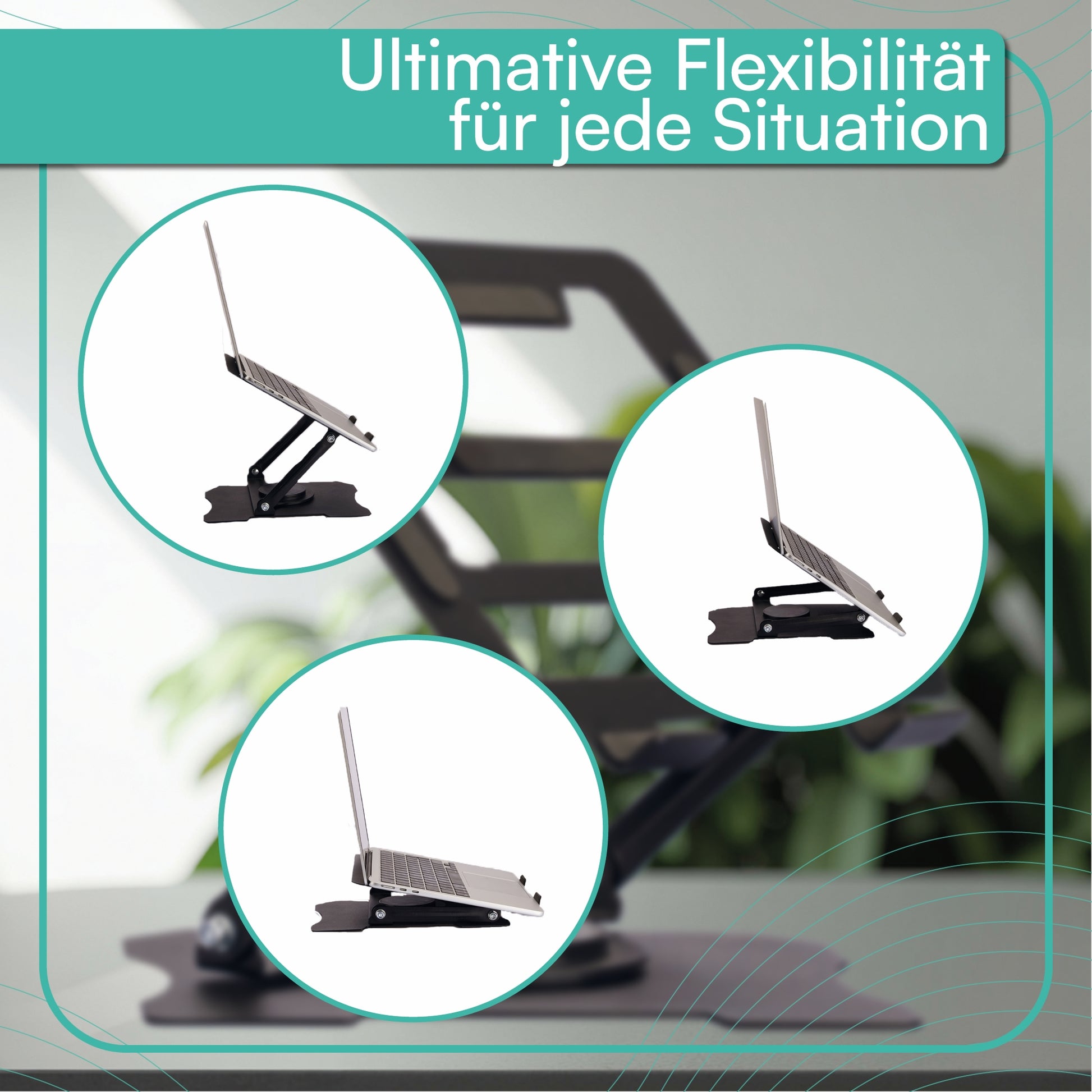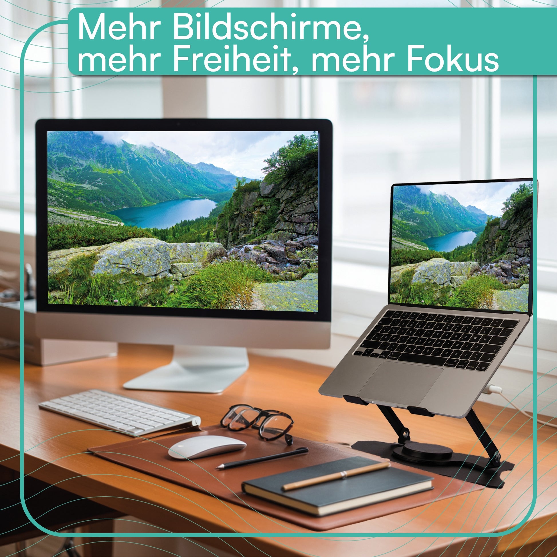 Dieser vielseitige Laptop Ständer von pixly wurde entwickelt, um den Arbeitsalltag komfortabler und ergonomischer zu gestalten. Das robuste, höhenverstellbare Design passt sich den individuellen Bedürfnissen an und fördert eine gesunde Körperhaltung bei langer Bildschirmarbeit. Die integrierte 360°-Drehfunktion ermöglicht eine schnelle und mühelose Ausrichtung des Bildschirms. Ideal für das Home-Office, im Büro oder auf Reisen, bietet der Ständer eine stabile und sichere Basis. Das offene Design sorgt für eine optimale Wärmeableitung und schützt das Notebook vor Überhitzung, während die rutschfesten Pads Kratzer vermeiden. Ein zuverlässiger Begleiter für jeden Schreibtisch.