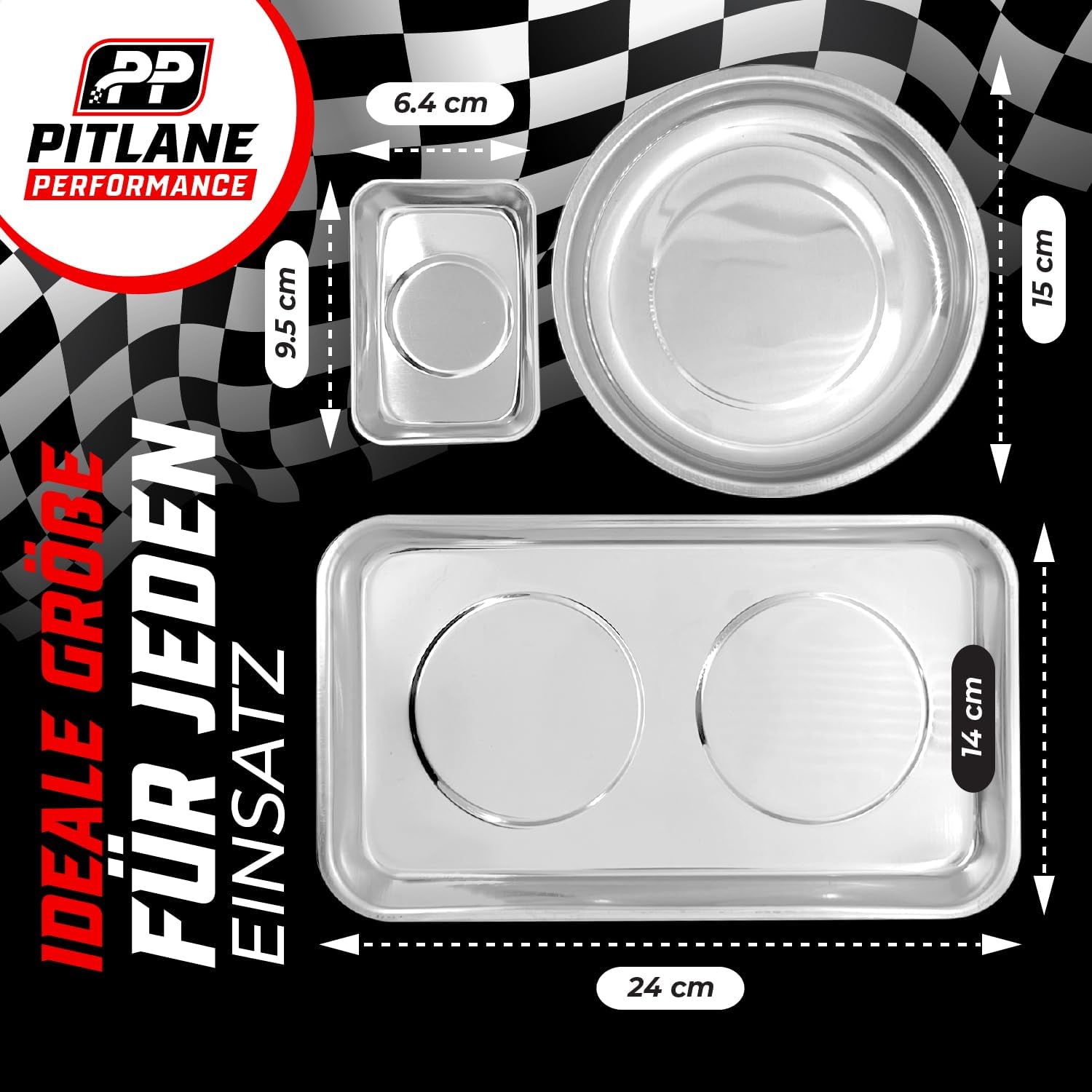 Das dreiteilige Magnet-Schalen-Set von Pitlane Performance bietet eine ideale Lösung zur sicheren Aufbewahrung und Organisation von Werkzeugen, Schrauben, Bohrern und Nägeln. Mit drei unterschiedlich großen Schalen – einer 24x14 cm großen rechteckigen Schale, einer runden Schale mit 15 cm Durchmesser und einer Mini-Schale mit 9,5x6,4 cm – passt sich dieses Set flexibel verschiedenen Aufbewahrungsbedürfnissen an.