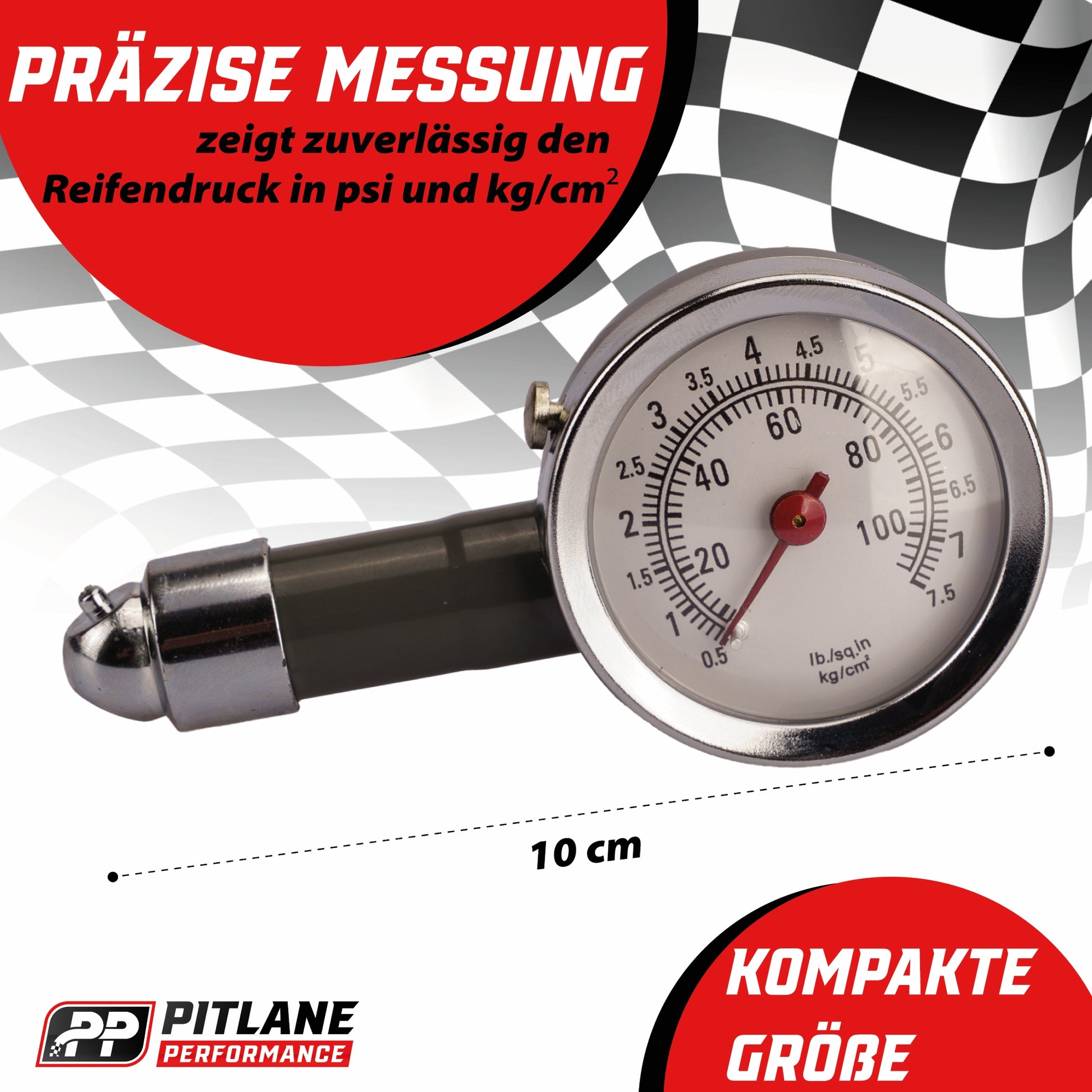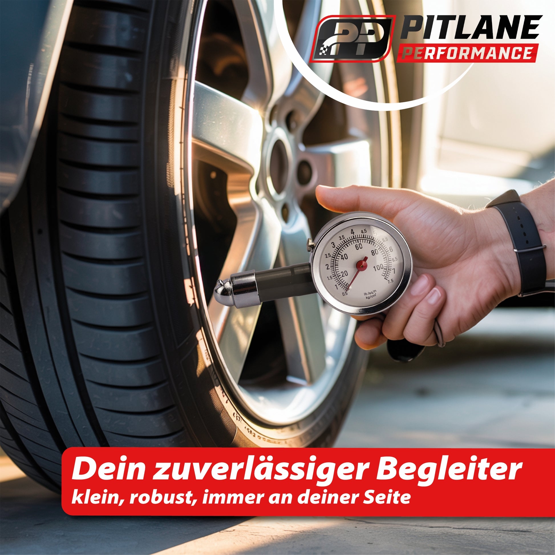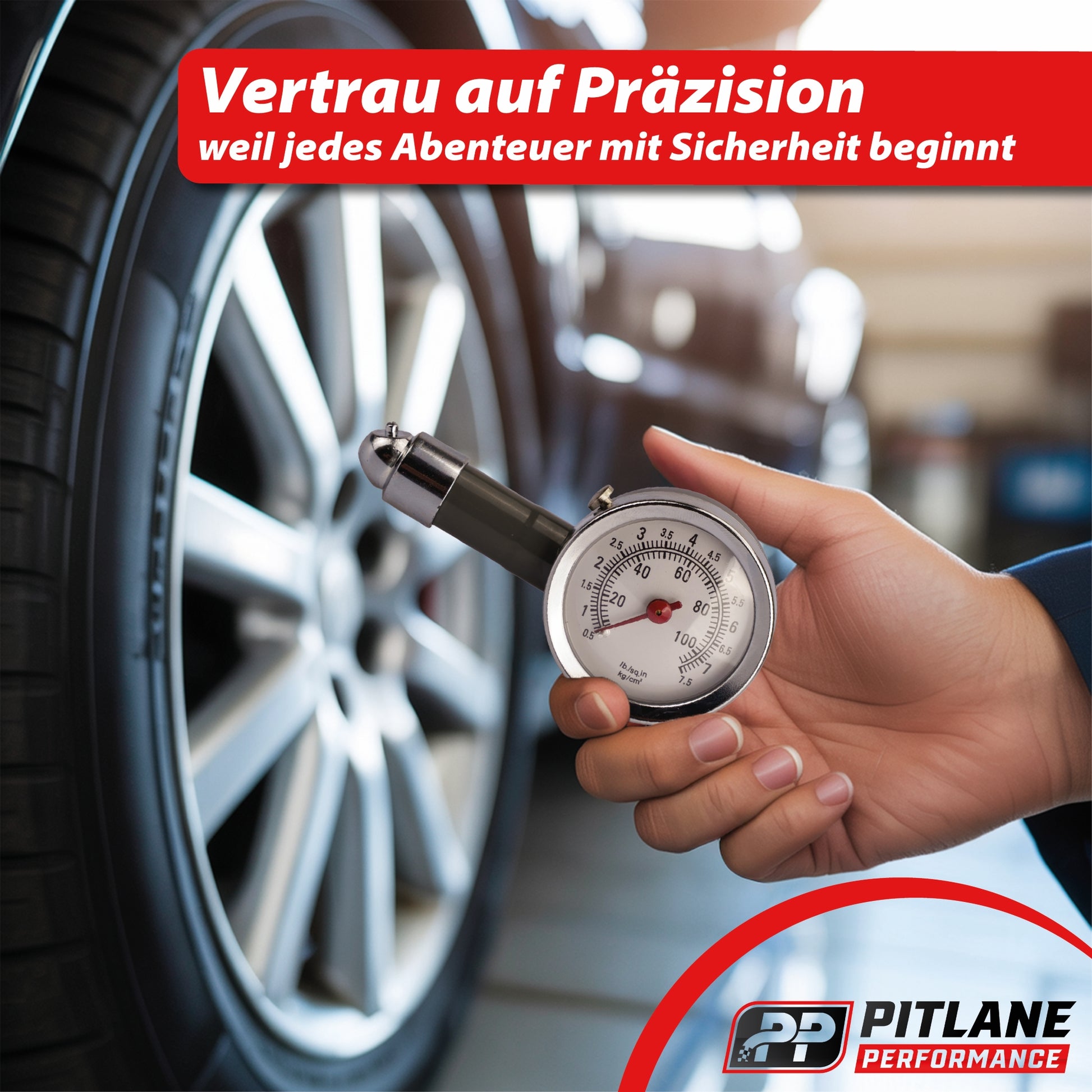 Der analoge Reifendruckprüfer von Pitlane Performance ist die praktische Lösung zur schnellen Kontrolle des Luftdrucks ideal für Auto, Fahrrad, Motorrad und mehr.