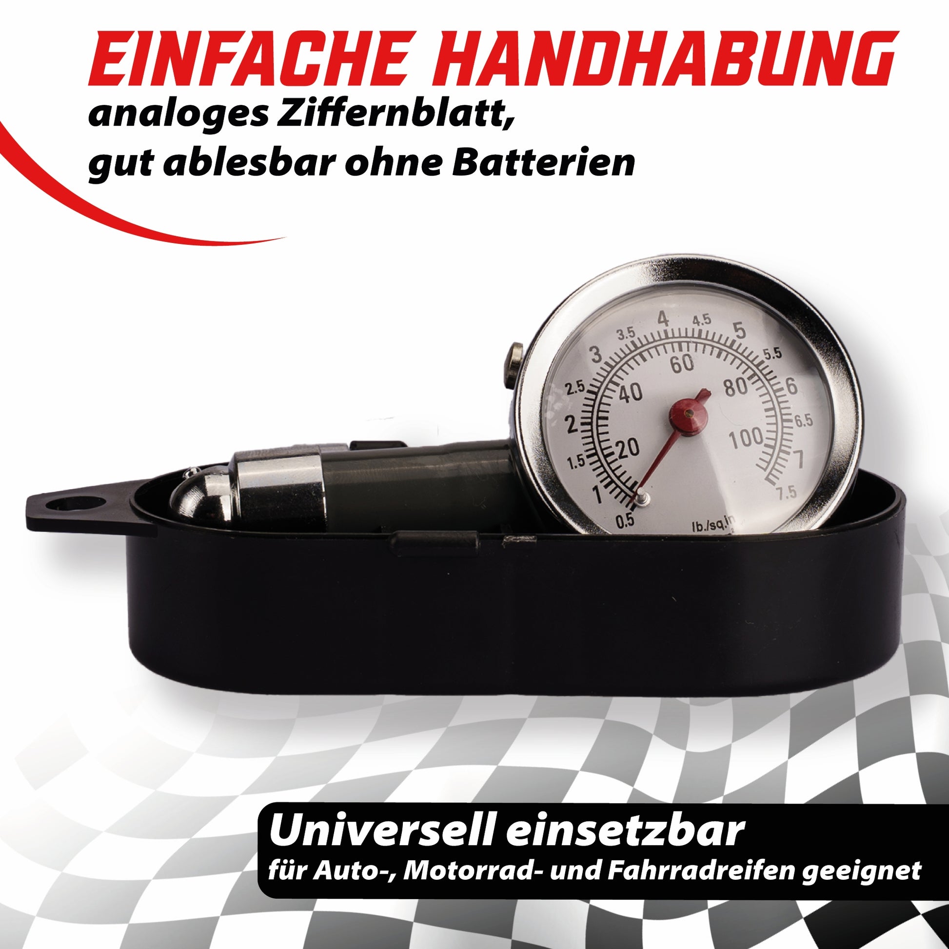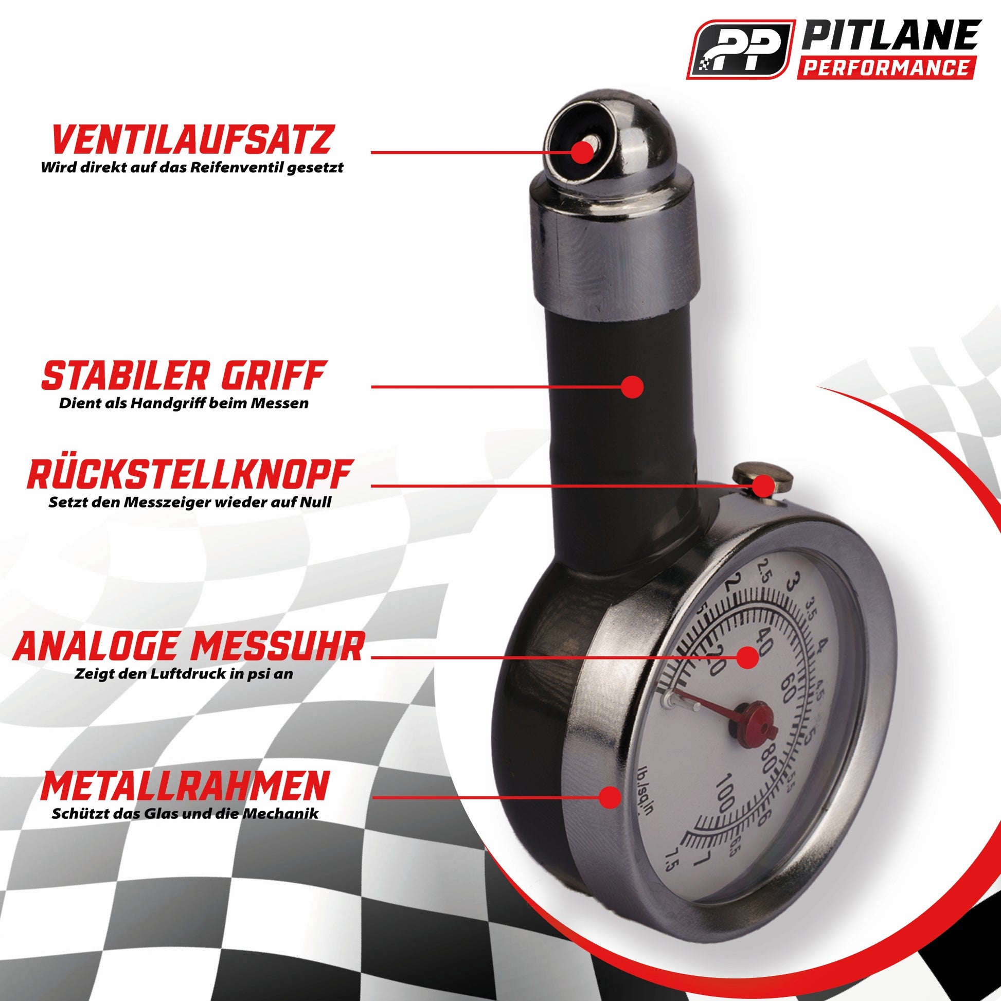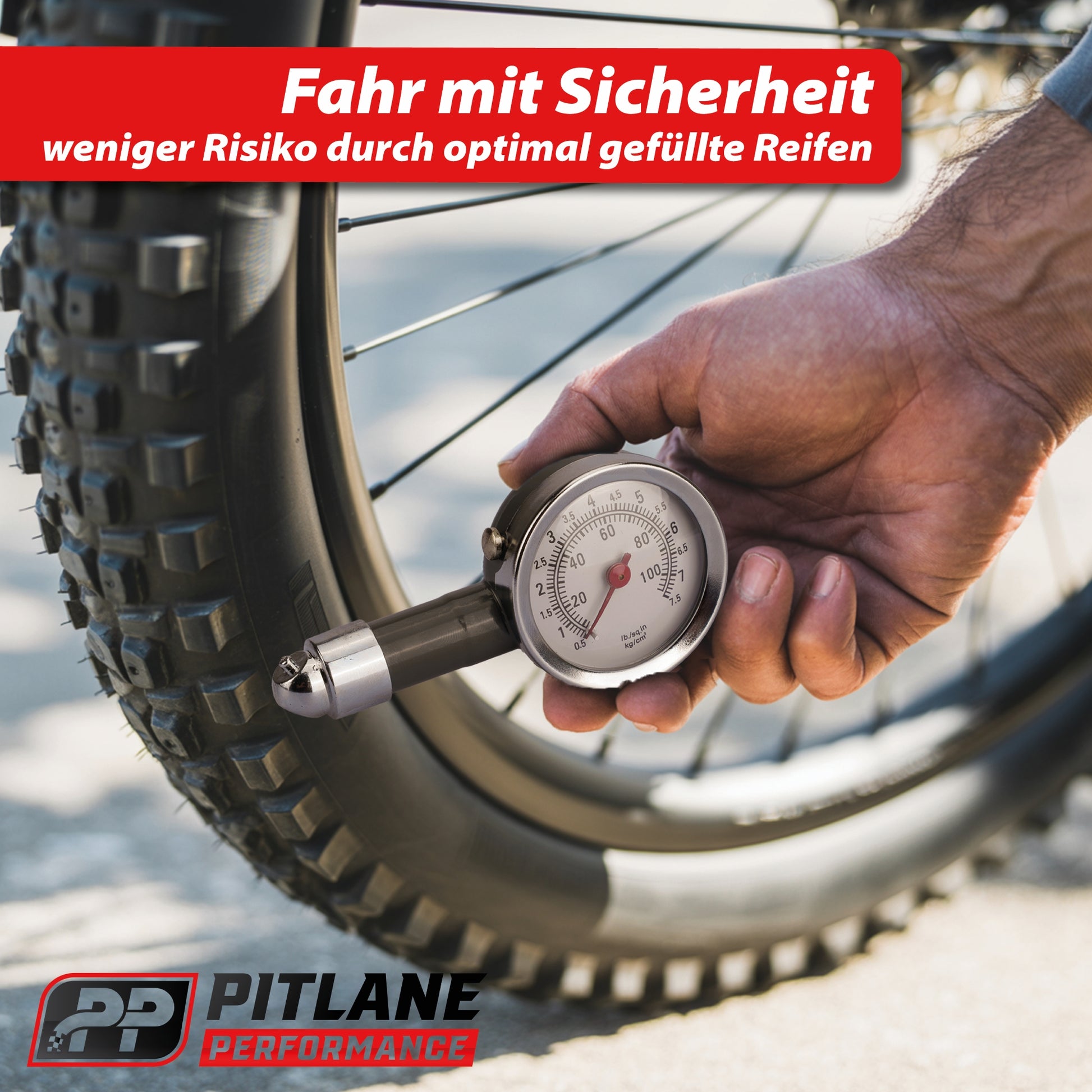 Der analoge Reifendruckprüfer von Pitlane Performance ist die praktische Lösung zur schnellen Kontrolle des Luftdrucks ideal für Auto, Fahrrad, Motorrad und mehr.