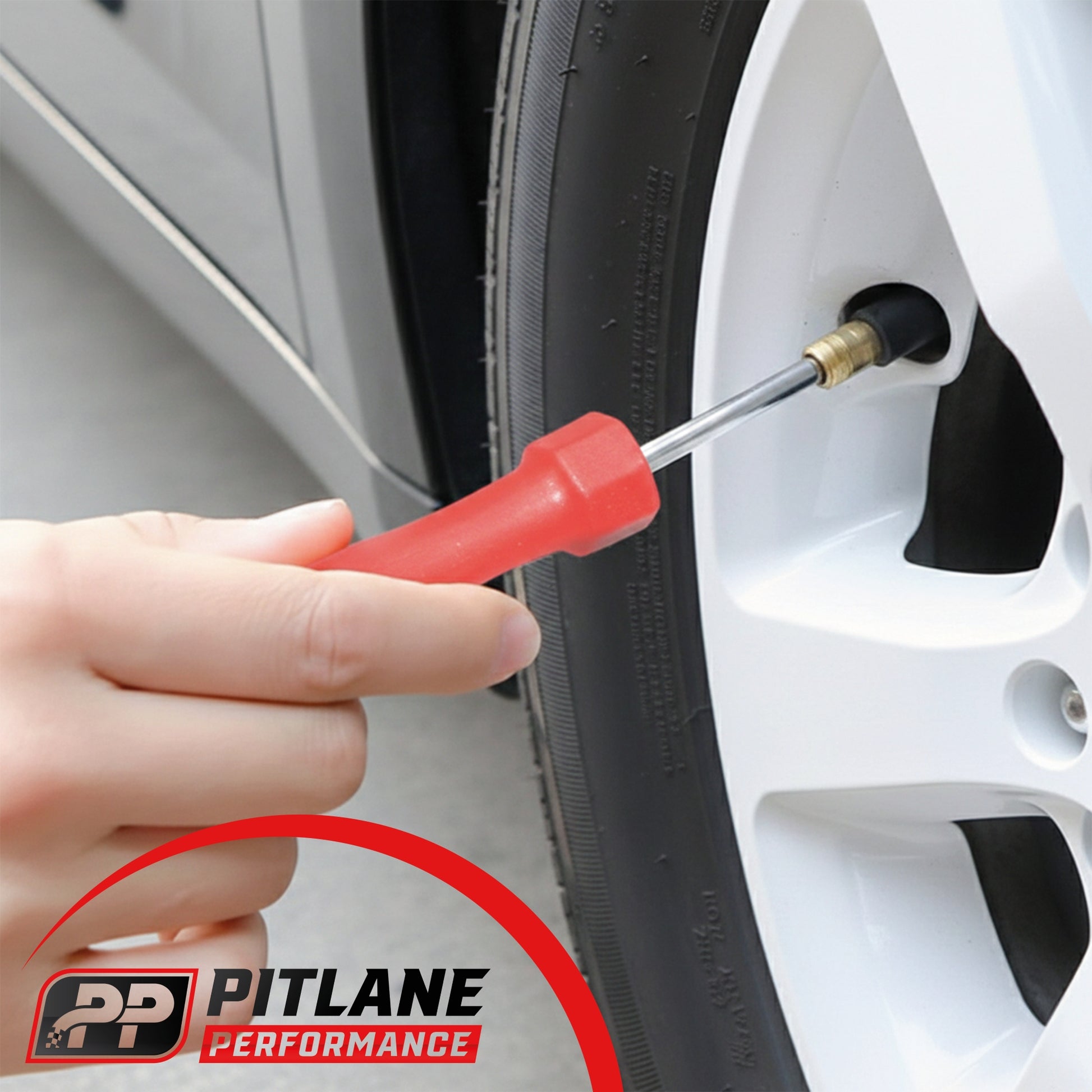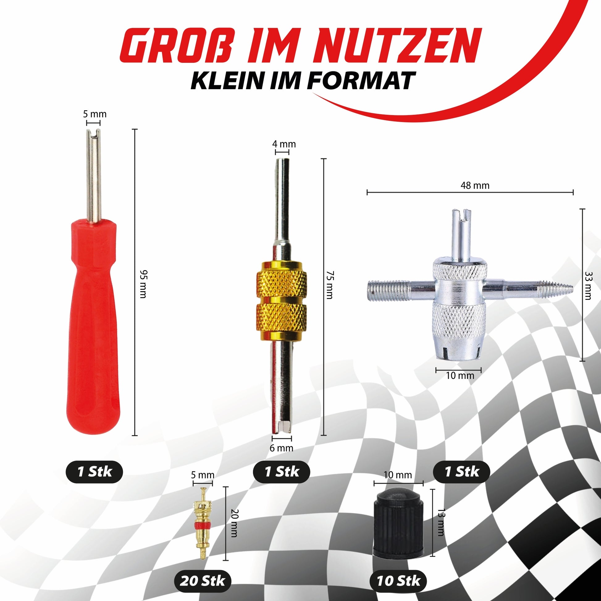 - 1x Ventilausdreher (Rot): Ein handliches Werkzeug mit ergonomischem Griff zur schnellen Demontage und Montage von Ventilkernen.